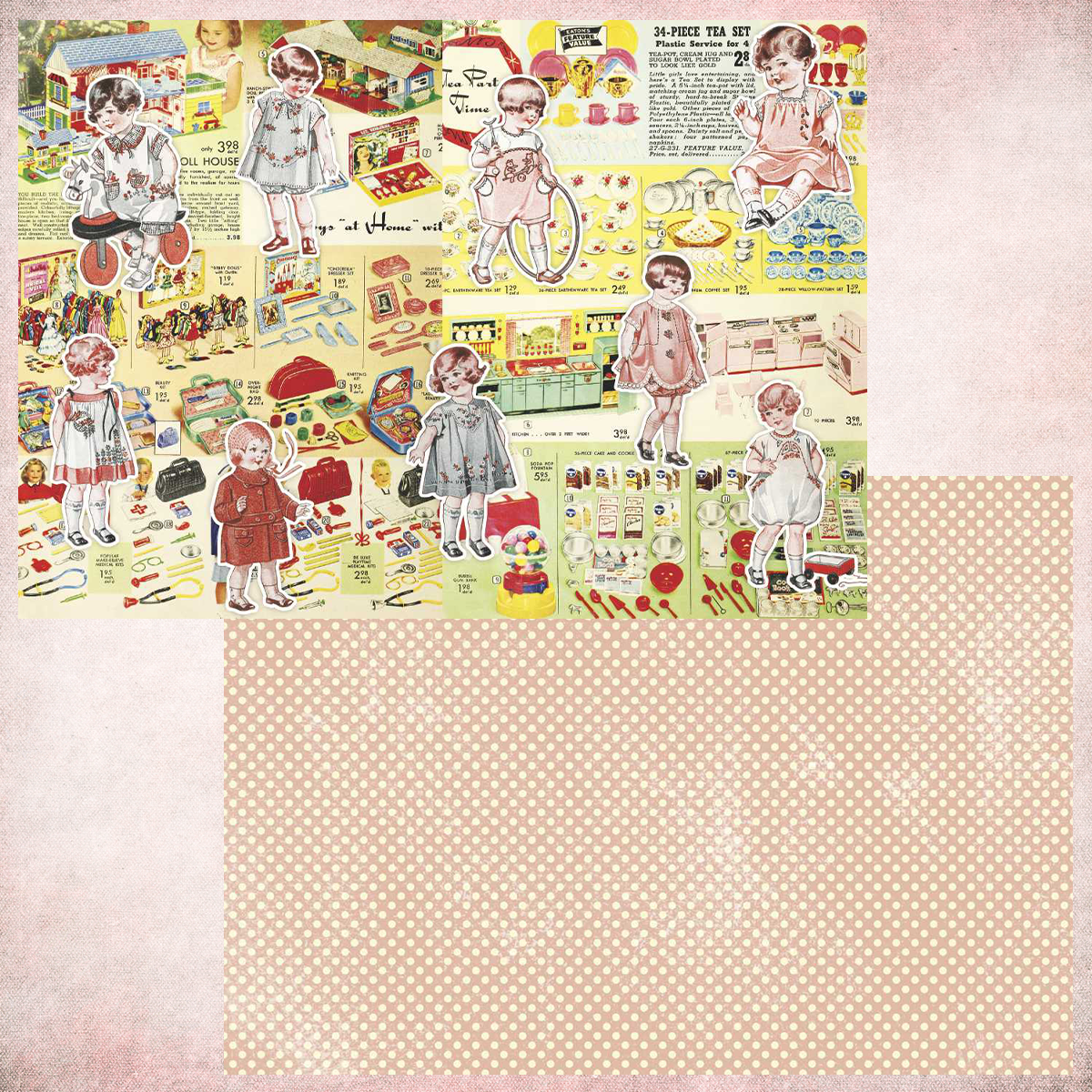 ペーパー【中薄紙:おもちゃ女の子】 仕様 おもちゃカタログデザインの女の子バージョン。 両面印刷で片側はピンクのドットになります。少し白インクで汚したような仕上がりにしています。 子供素材をカットしてコラージュにも使いやすいサイズ感です。 中薄紙の上質紙70kgで仕上げております。 A4両面カラー:上質紙70kg 10枚セット ※商用利用不可 在庫状態 : 売り切れ ¥400 只今お取扱い出来ません