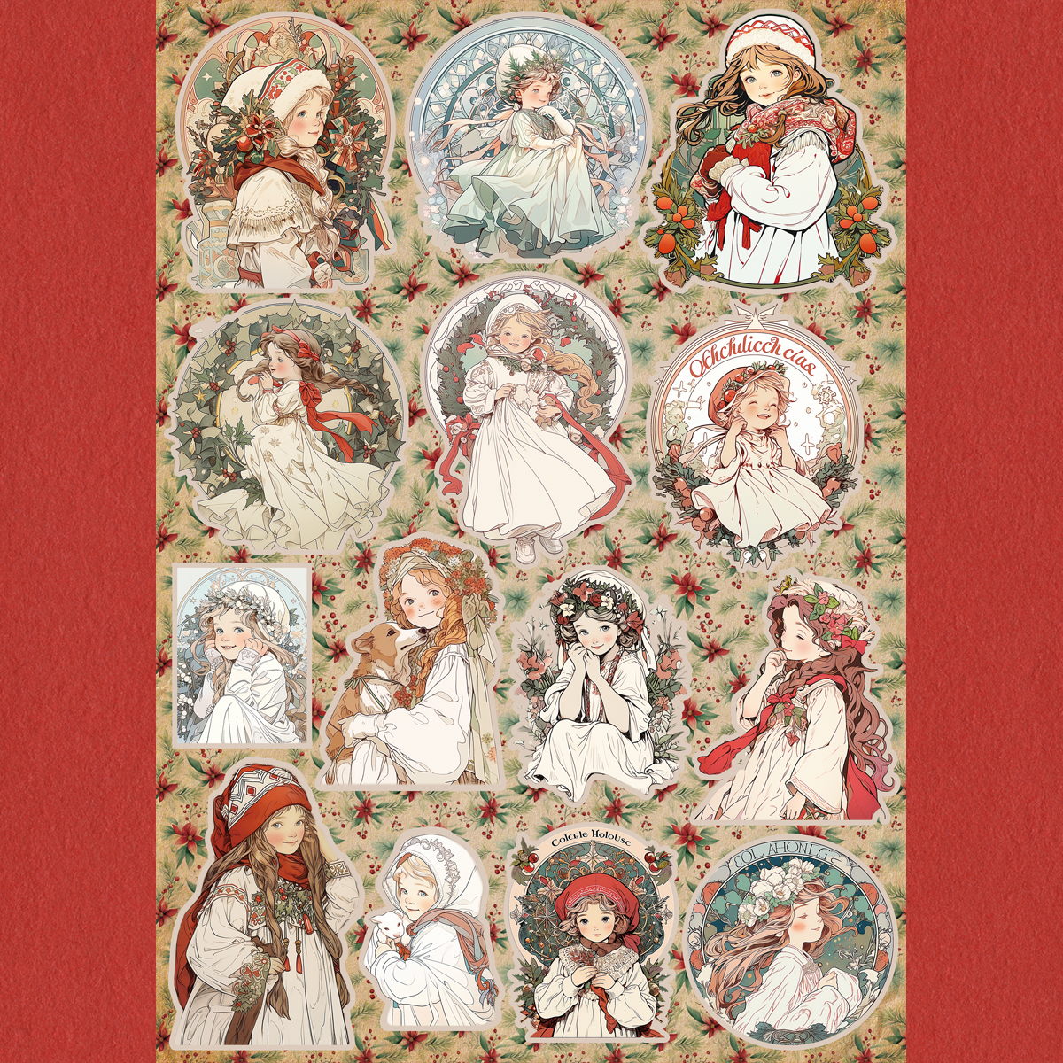 アールヌーボ調のアニメ絵タッチのクリスマス女の子コラージュシートです。