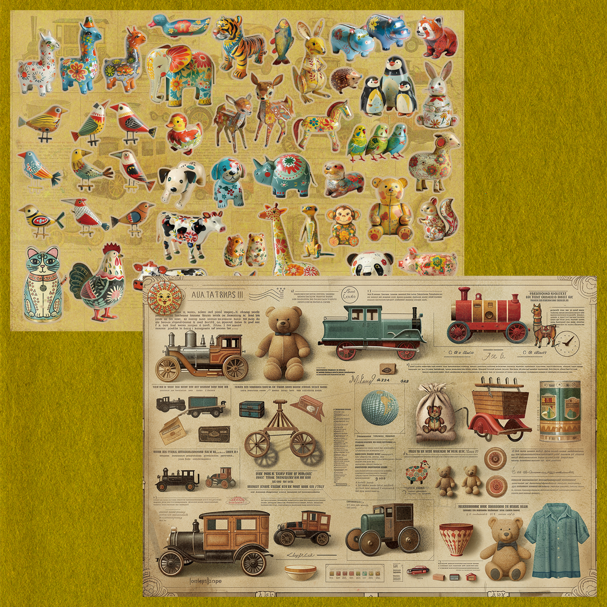 レトロで可愛いブリキのおもちゃとおもちゃカタログ風のデザイン。