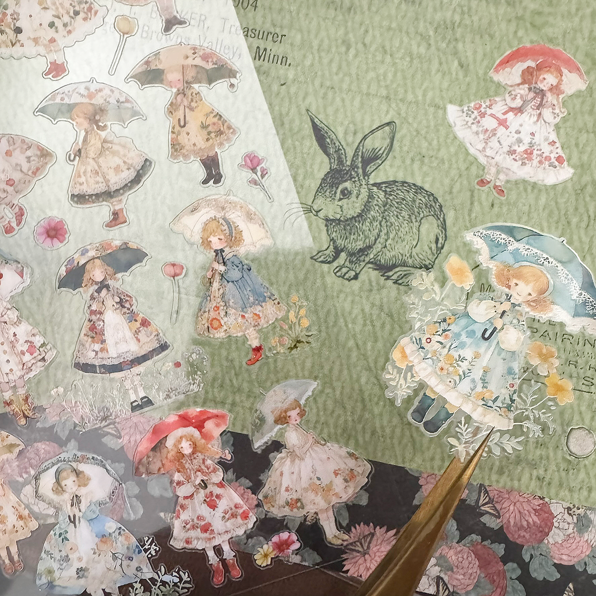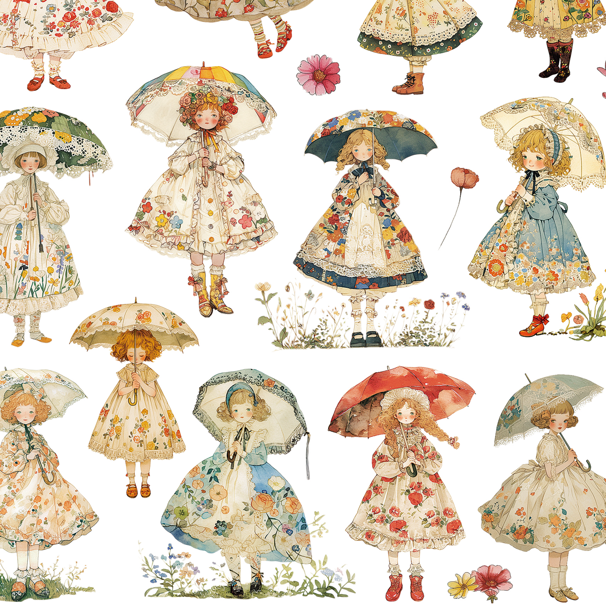 傘を差しているナチュラルテイストの女の子ステッカーデザインです。