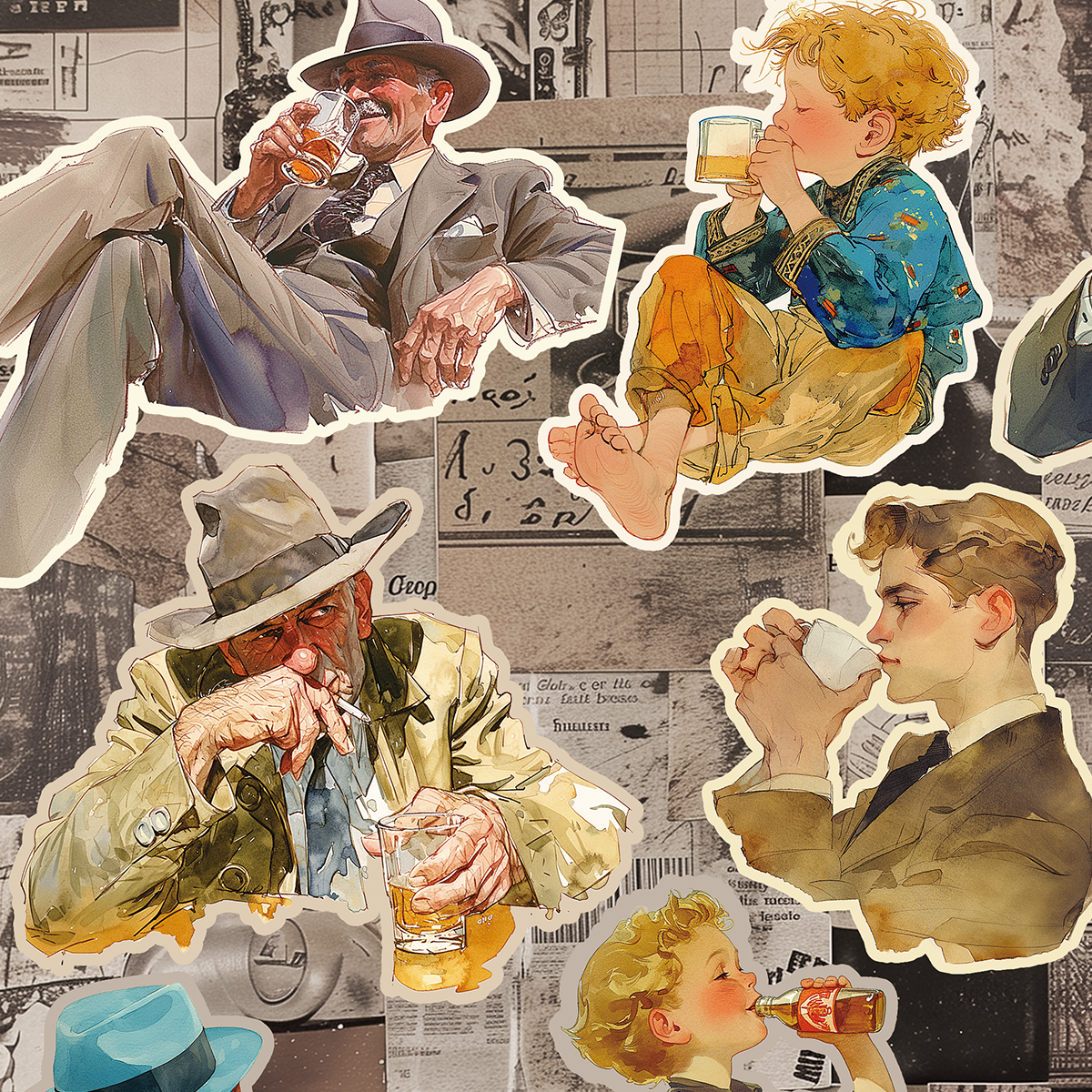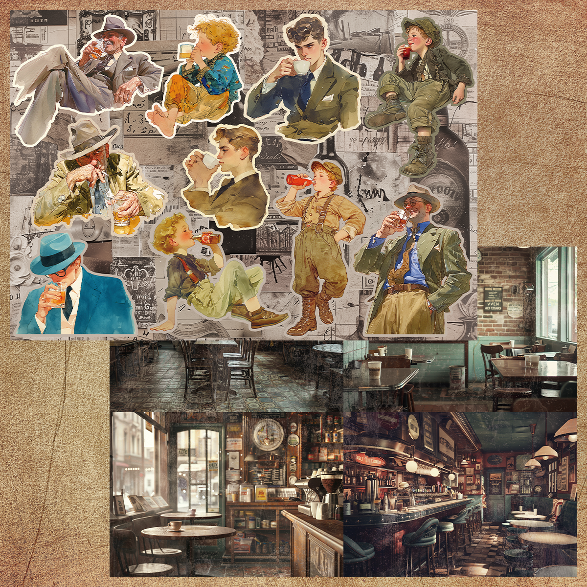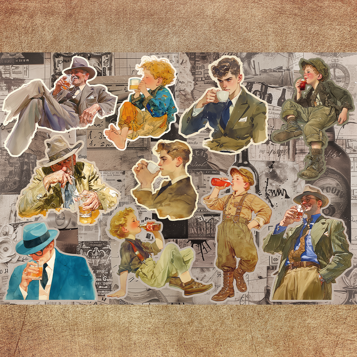 ペーパー【厚紙110kg:ドリンク時間】 仕様 ビンテージの本の挿絵のようなテイストのコラージュシート。 それぞれの人物が楽しい飲み物時間を過ごしています。 片面はカフェや飲み物屋さんの風景でまとめました。 カットしてご利用ください。 当店オリジナルの素材を使用しています。 A4両面カラー印刷:上質紙110kg 10枚セット ※商用利用可能 ただしカットしたものをそのまま販売は御遠慮ください。 在庫状態 : 売り切れ ¥450 只今お取扱い出来ません