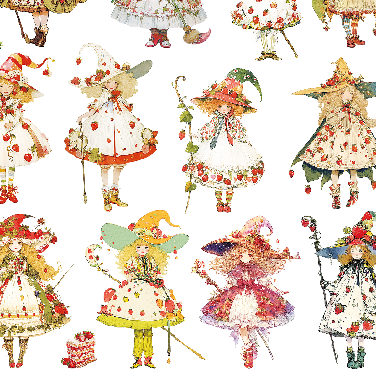古い児童書から出てきたようなレトロ可愛いいちごの魔法使いのステッカーです。