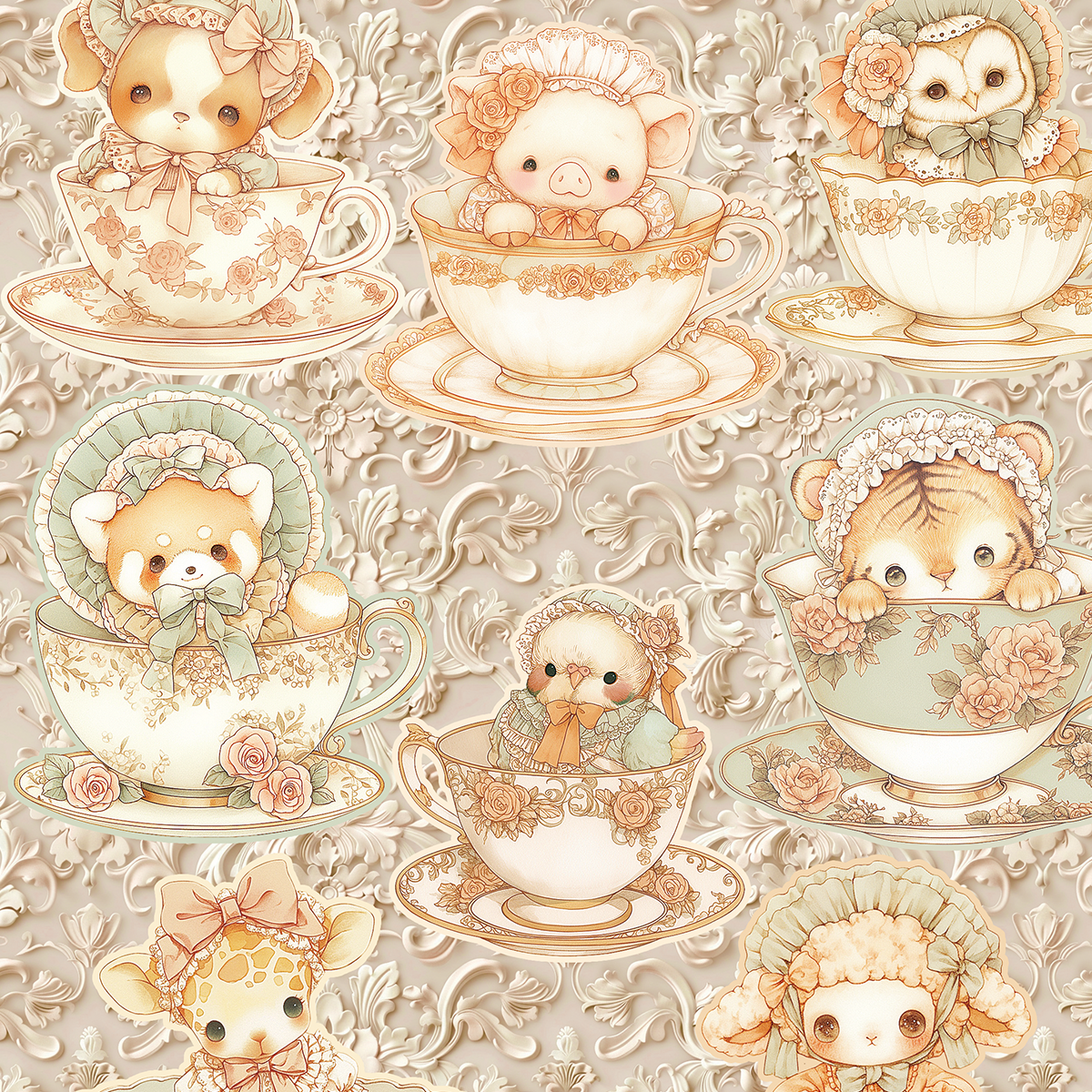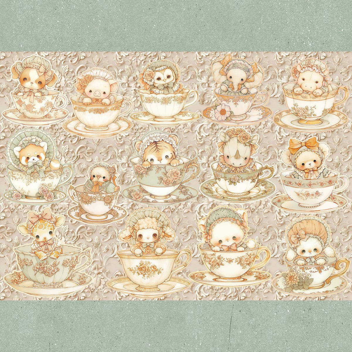 ペーパー【厚紙110:動物ティーカップ】 仕様 動物がティーカップの中から覗いているコラージュシートです。 カットしてご利用ください。 片面はアンティークな落ち着いたゴシックデザインです。 当店オリジナルの素材を使用しています。 A4両面カラー印刷:上質紙110kg 10枚セット ※商用利用可能 ただしカットしたものをそのまま販売は御遠慮ください。 在庫状態 : 売り切れ ¥450 只今お取扱い出来ません
