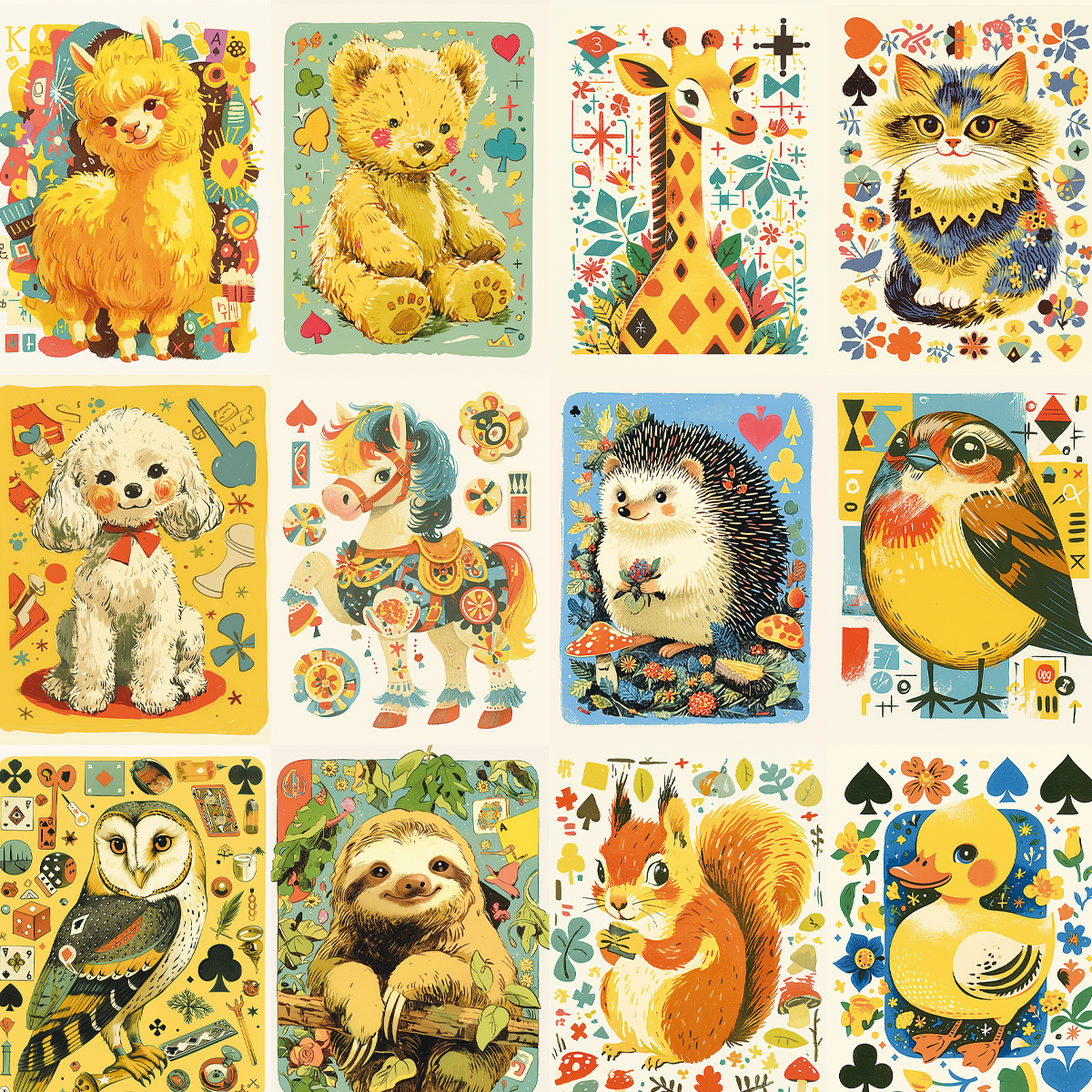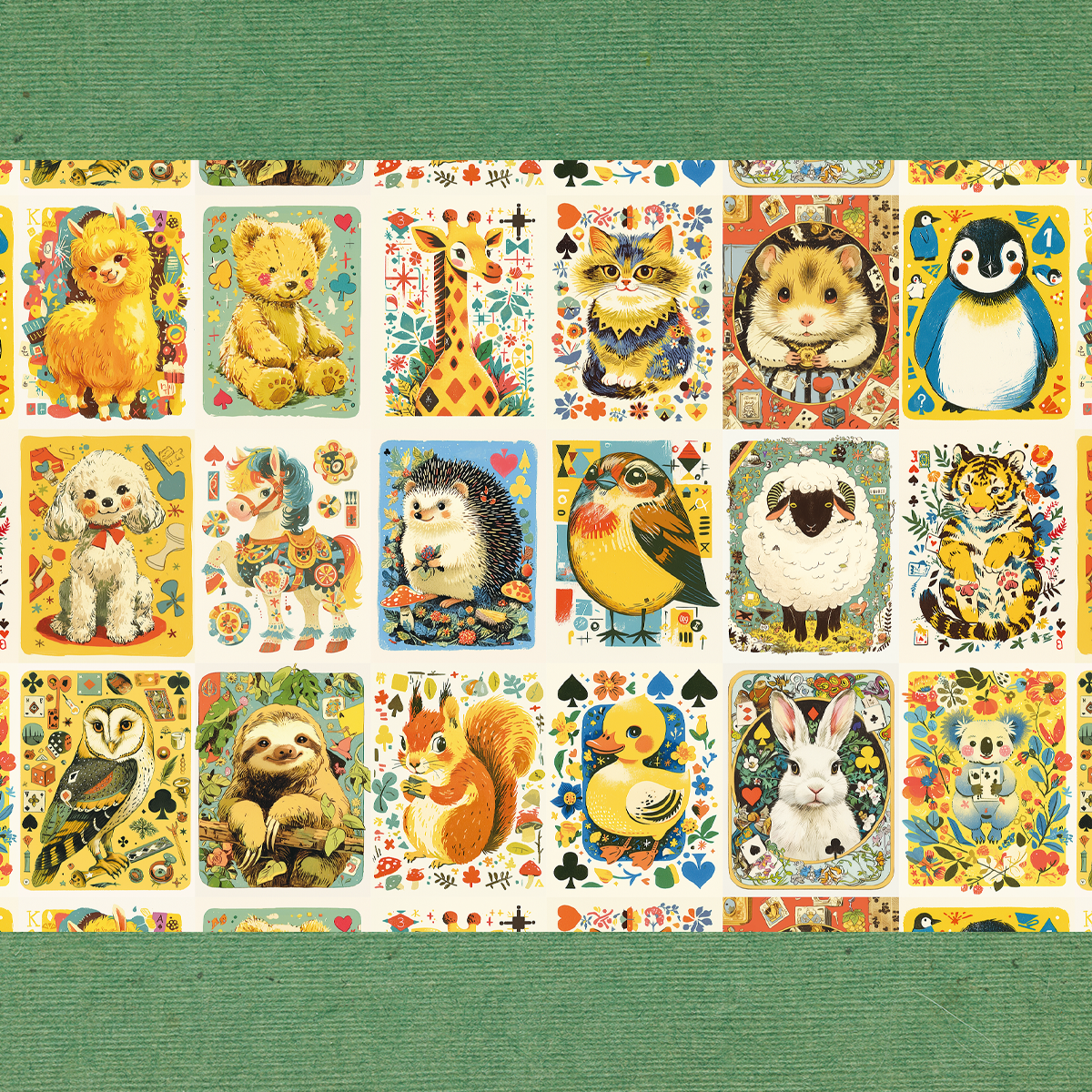 ペーパー【厚紙135kg:動物カードゲーム】 仕様 動物のカードゲームのようなデザインです。 片面は東欧のレトロな雰囲気のパターンです。 当店オリジナルの素材を使用しています。 A4両面カラー:上質紙135kg 10枚セット ※商用利用可 ※当店ではデフォルメされた素材などを使用しています。リアルさをお求めの方は見本の詳細を見て頂きご購入をお願いいたします。 ※AIでの素材作成、テキスト作成やビンテージの素材を使用しておりますので苦手な方はご遠慮ください。 在庫状態 : 売り切れ ¥480 只今お取扱い出来ません