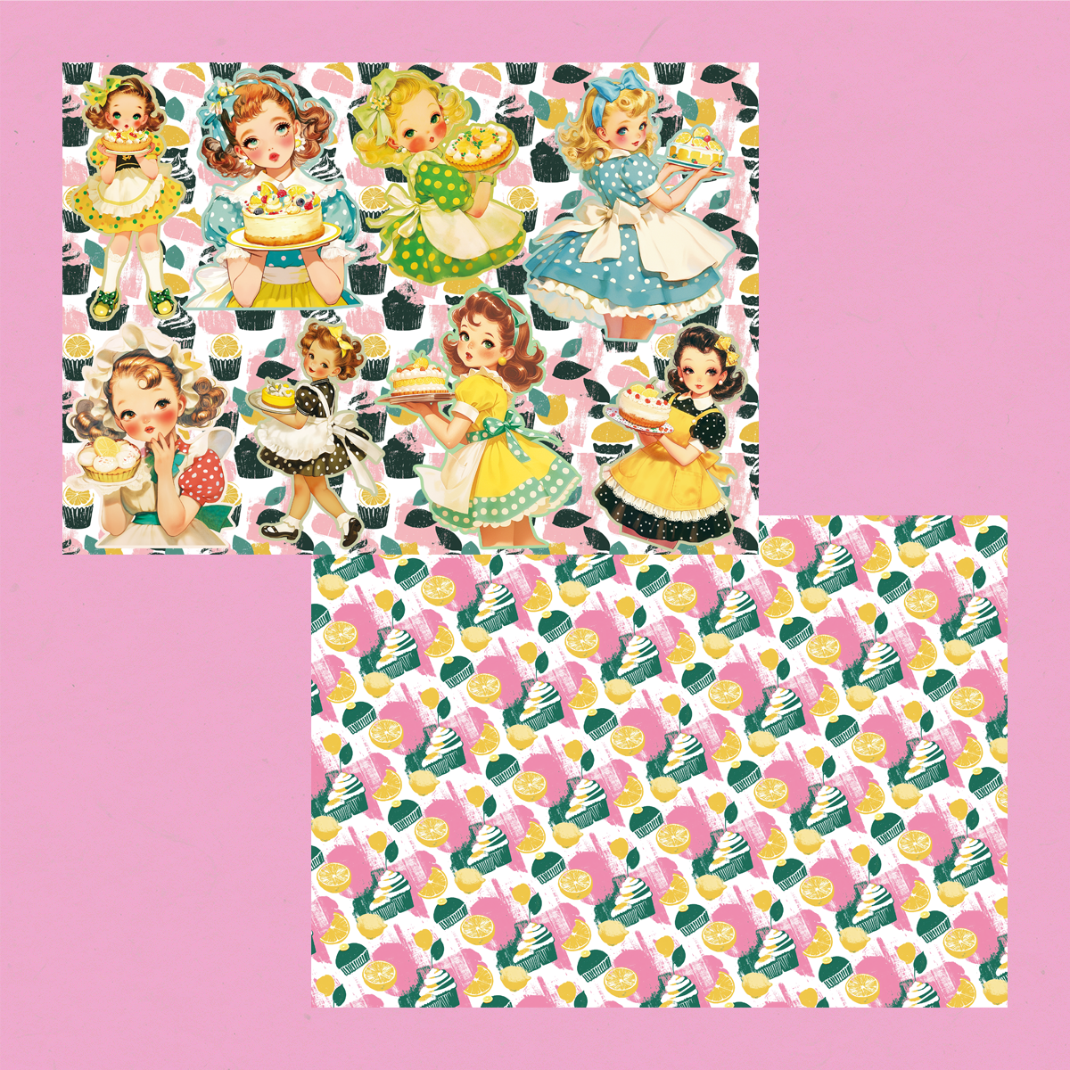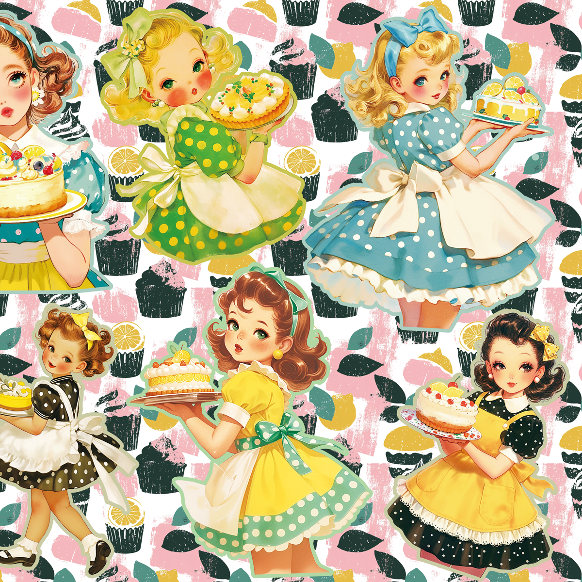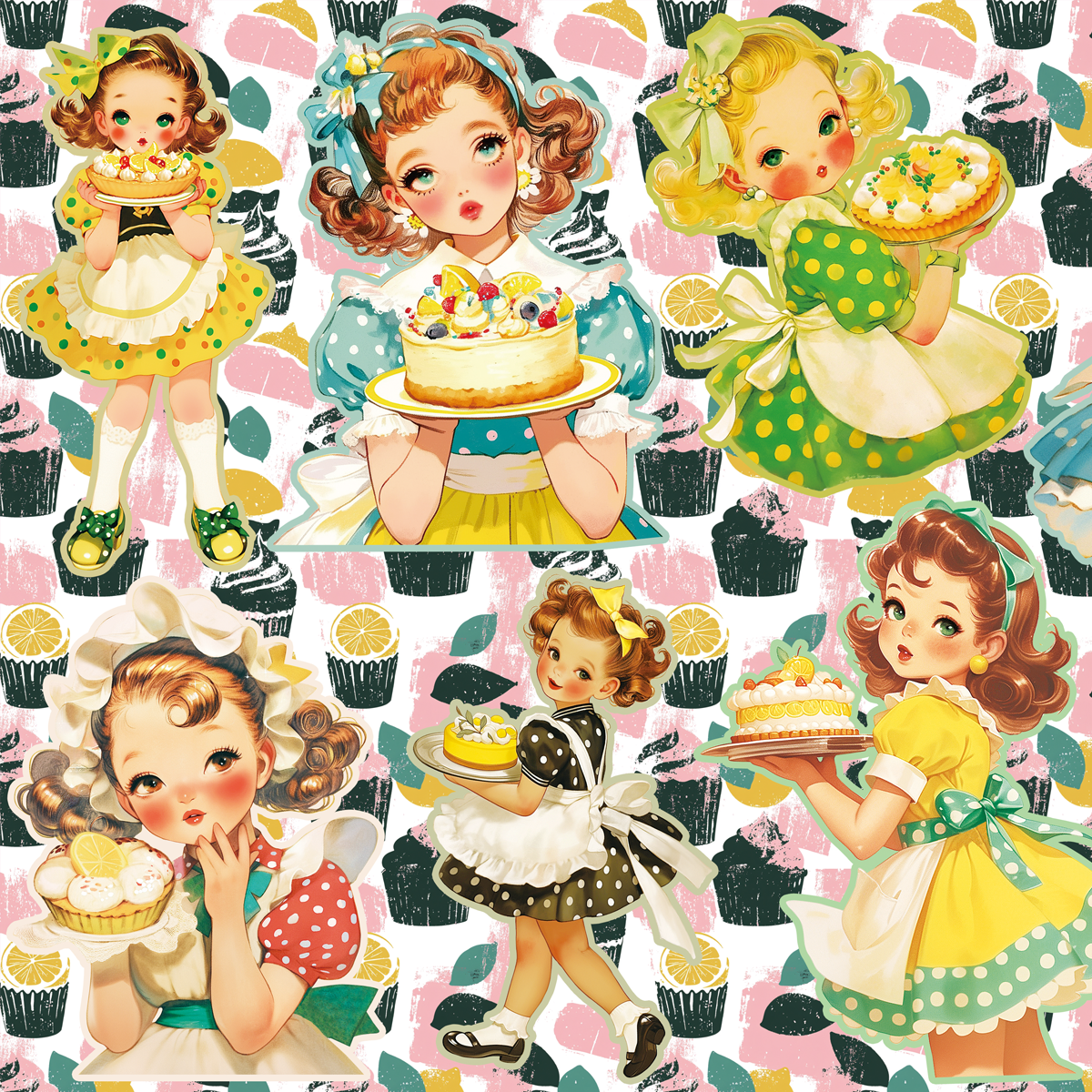 レトロ可愛いテイストのデザート運ぶ女の子のコラージュシートです。