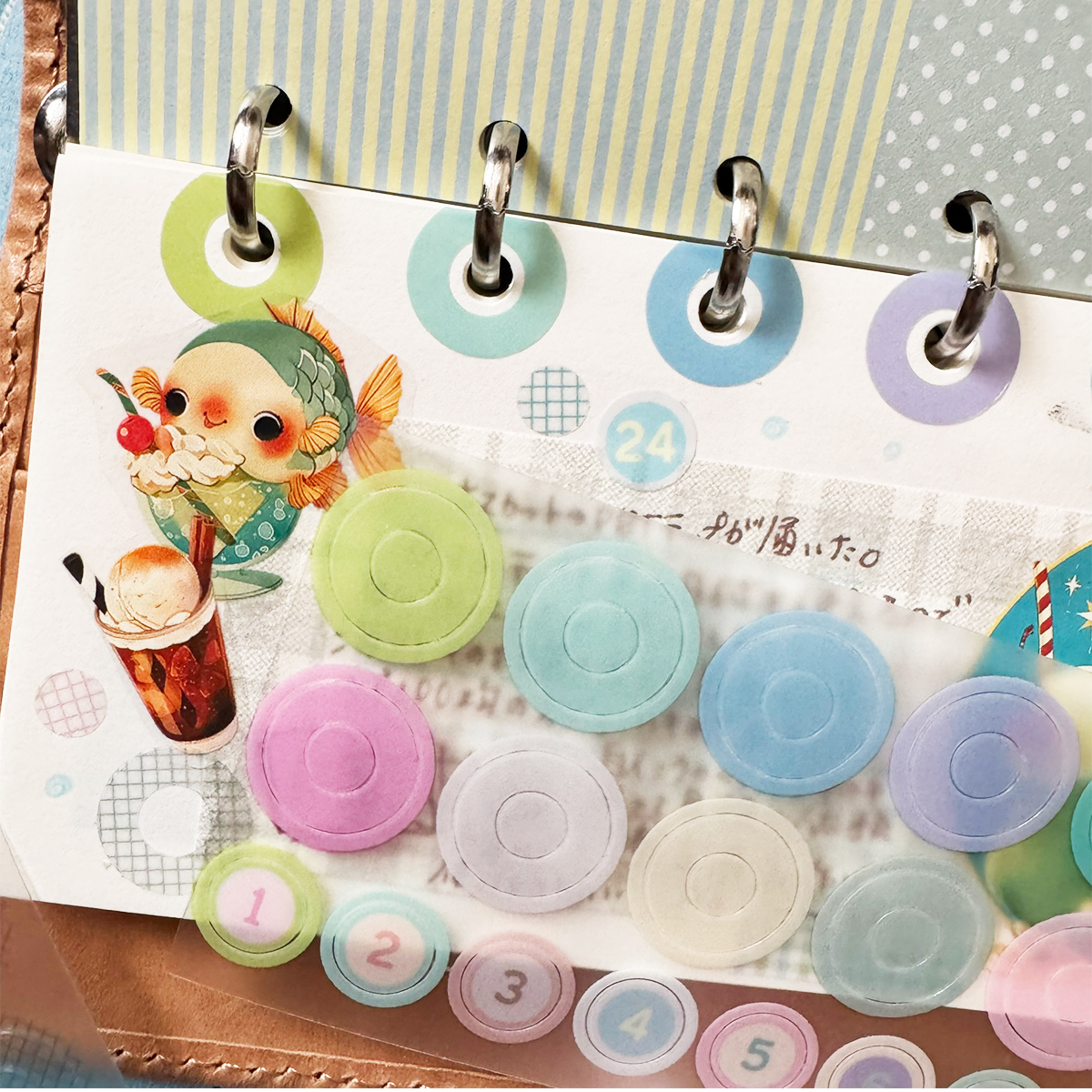 穴補強は直径約1.5cm、日付素材は8mmの小さな素材です。