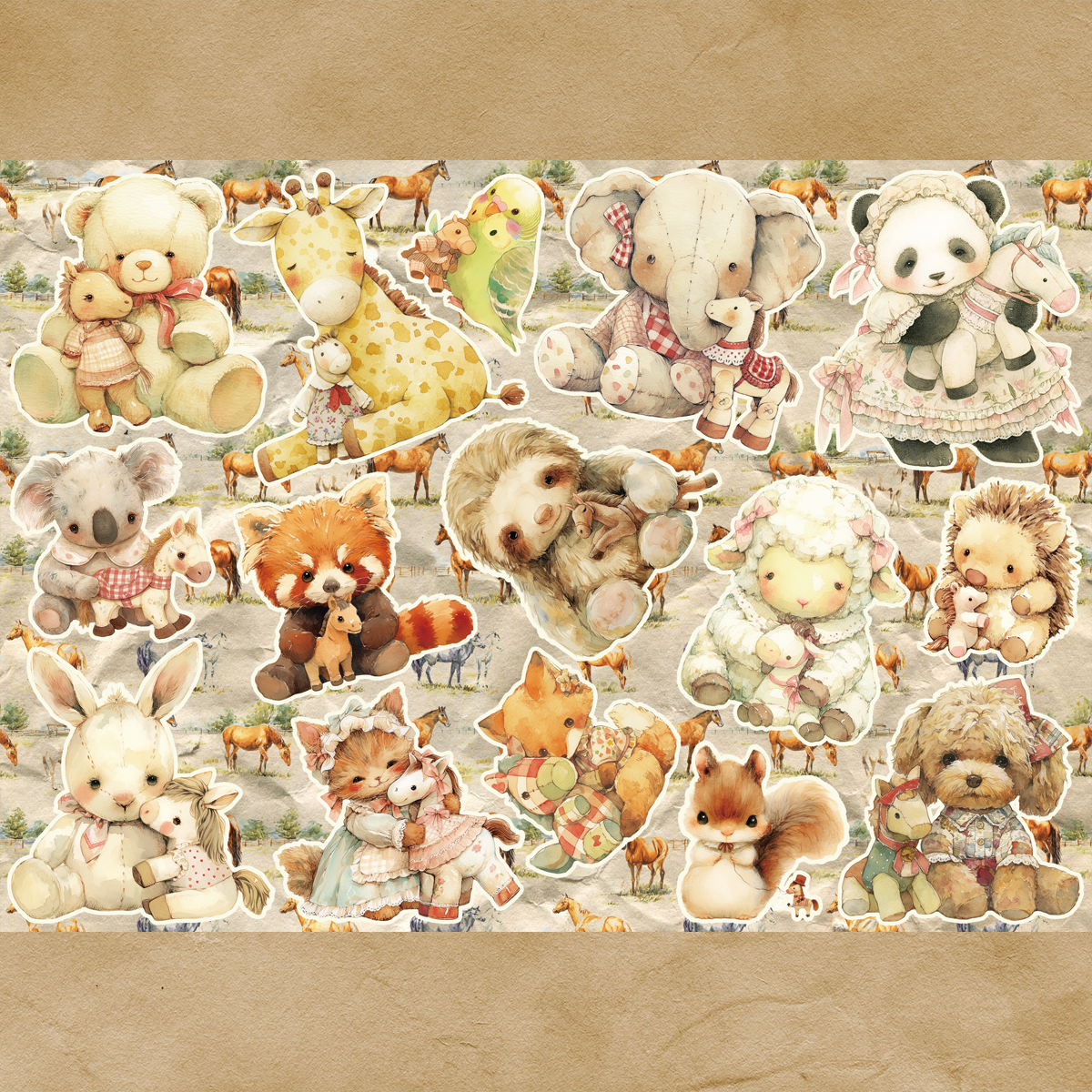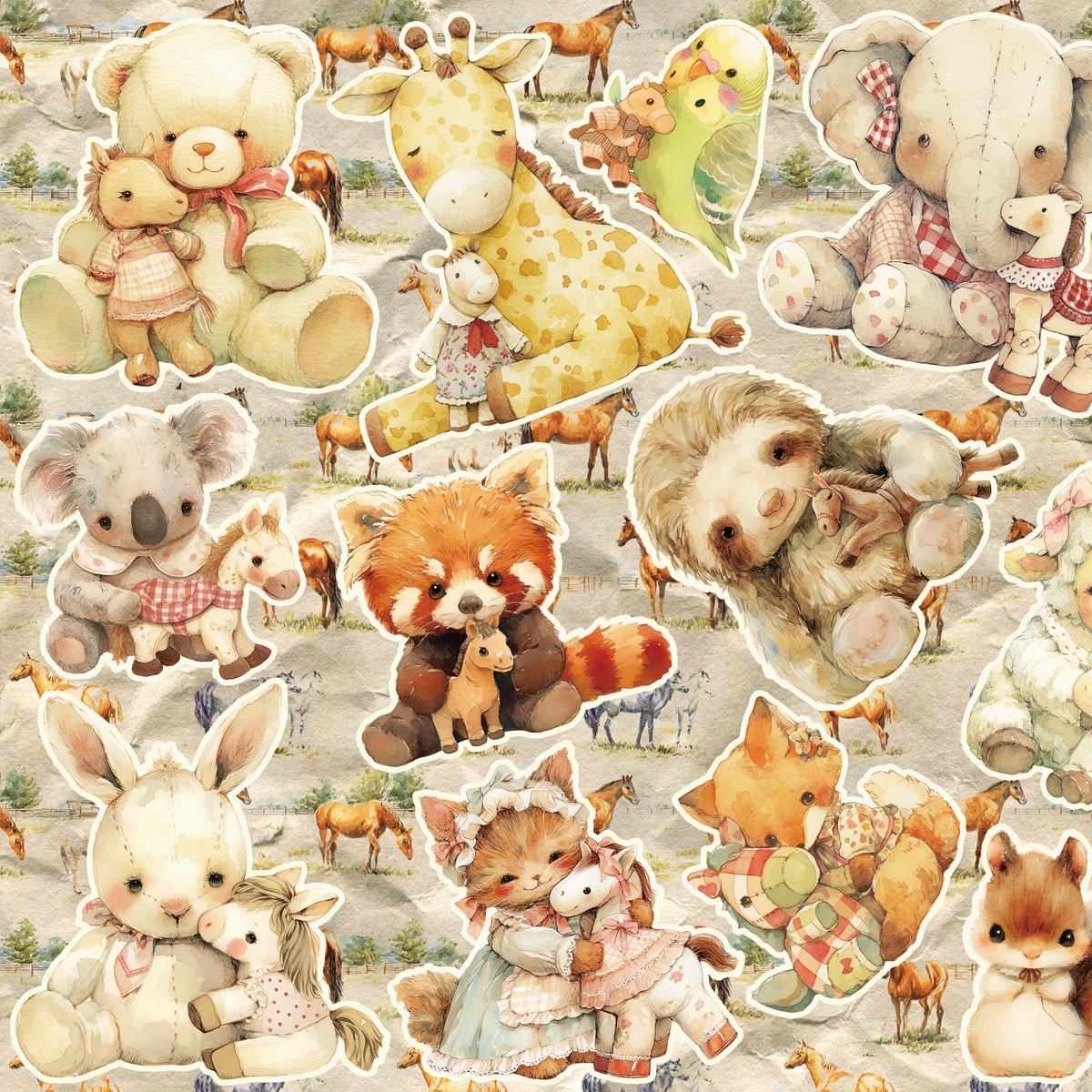 馬のぬいぐるみを抱いた動物たちのコラージュシート。
